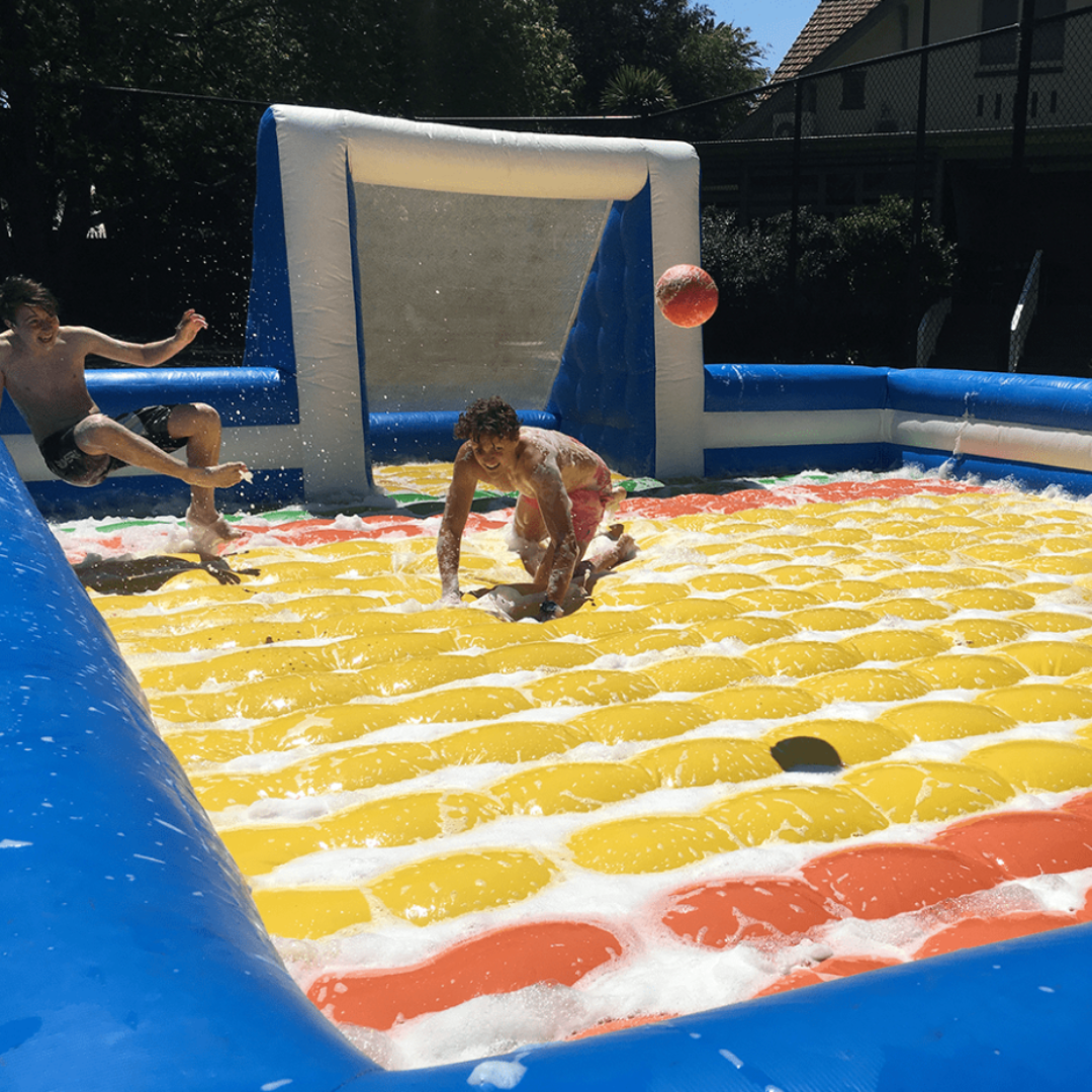 Get ready for a day of fun with Soapy Soccer! This exciting and hilarious game is played on a specially designed inflatable soccer pitch. The surface is covered in water and soap to create a slippery and soapy playing field. Gather up to 8 of your friends for a thrilling 3 vs 3 or 4 vs 4 game. The challenge? To stay on your feet and play soccer without slipping and sliding everywhere (which may be harder than it sounds)! The package includes everything you need for an unforgettable day: - The Slip N Slide Soapy Soccer Inflatable - Super Soakers + Flag Grid Iron - Chicken Run + Ultimate Frisbee - Plus, a JBL speaker to keep the energy high